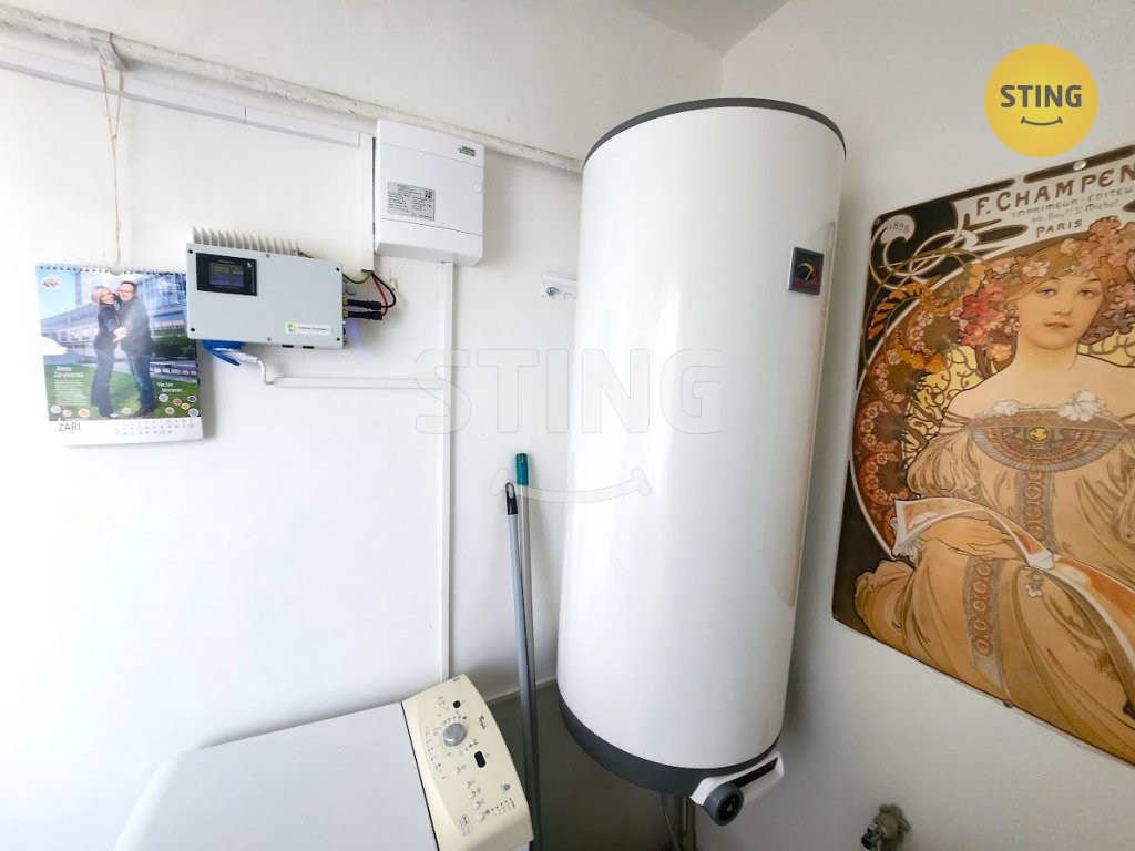 elektrickým bojlerem. Na střeše fotovoltaika. V samostatném pokoji se topí
