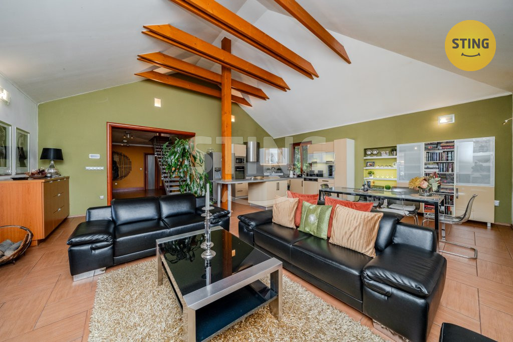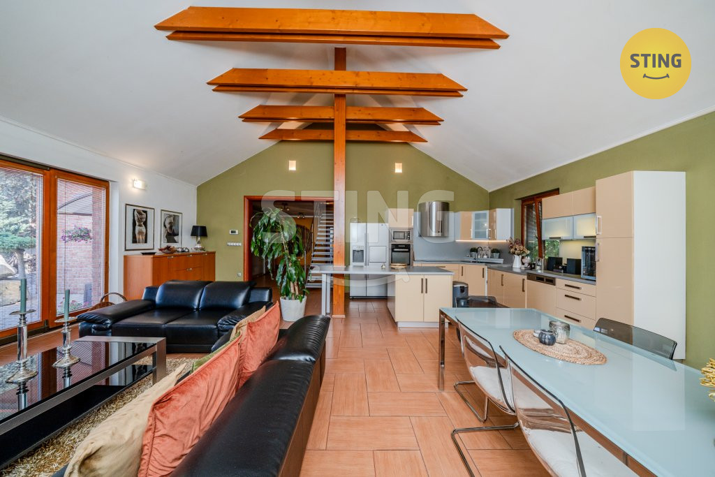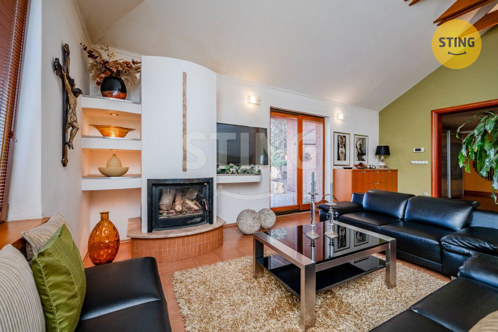 se vstupem na terasu. Atmosféru prostoru umocňuje krb s výměníkem. Prostor
