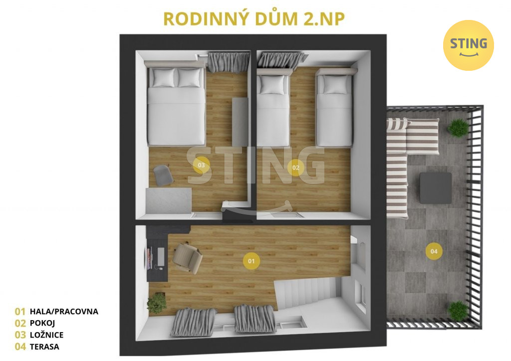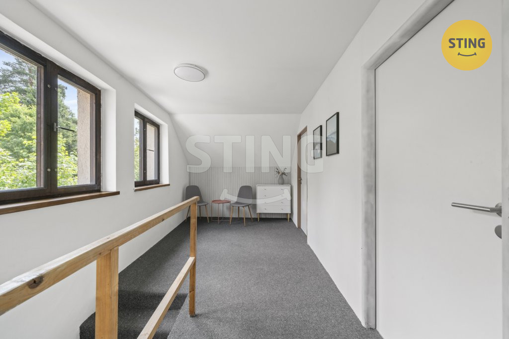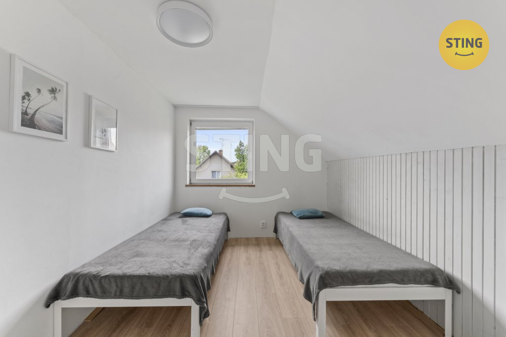 V patře jsou dvě samostatné ložnice orientované do klidného dvora a