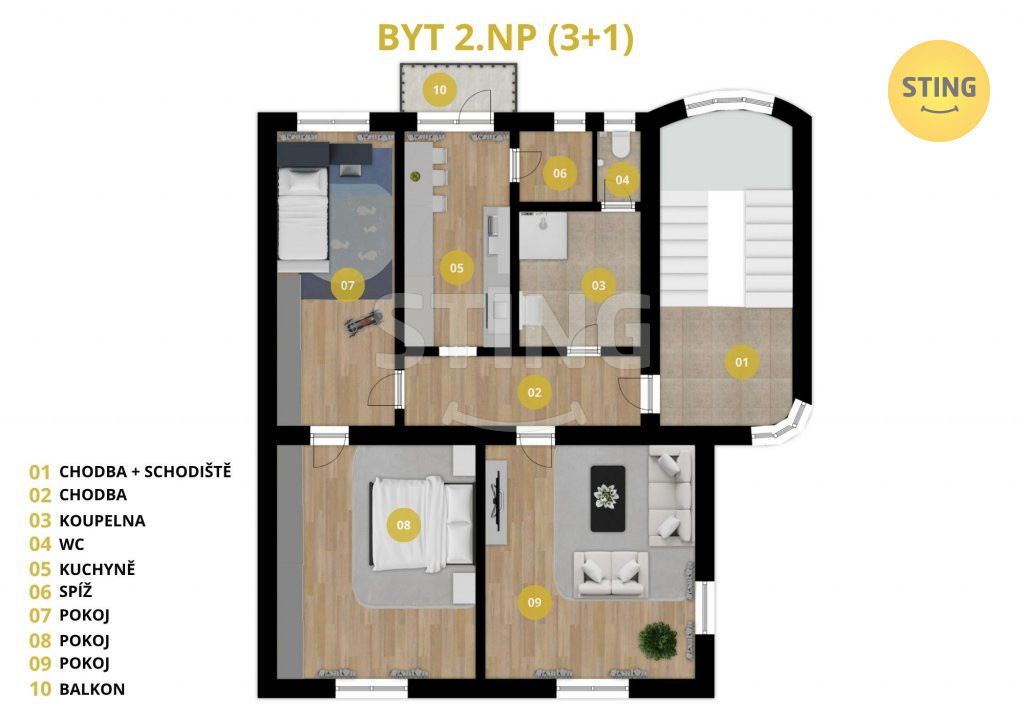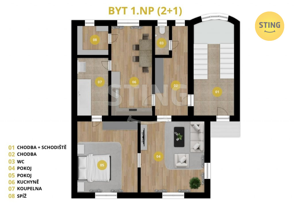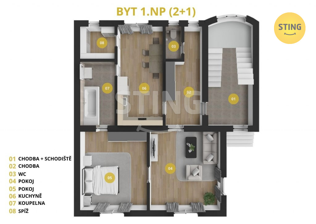 v patře je byt 3+1 s příslušenstvím a balkonem. V 1.PP je sklep a