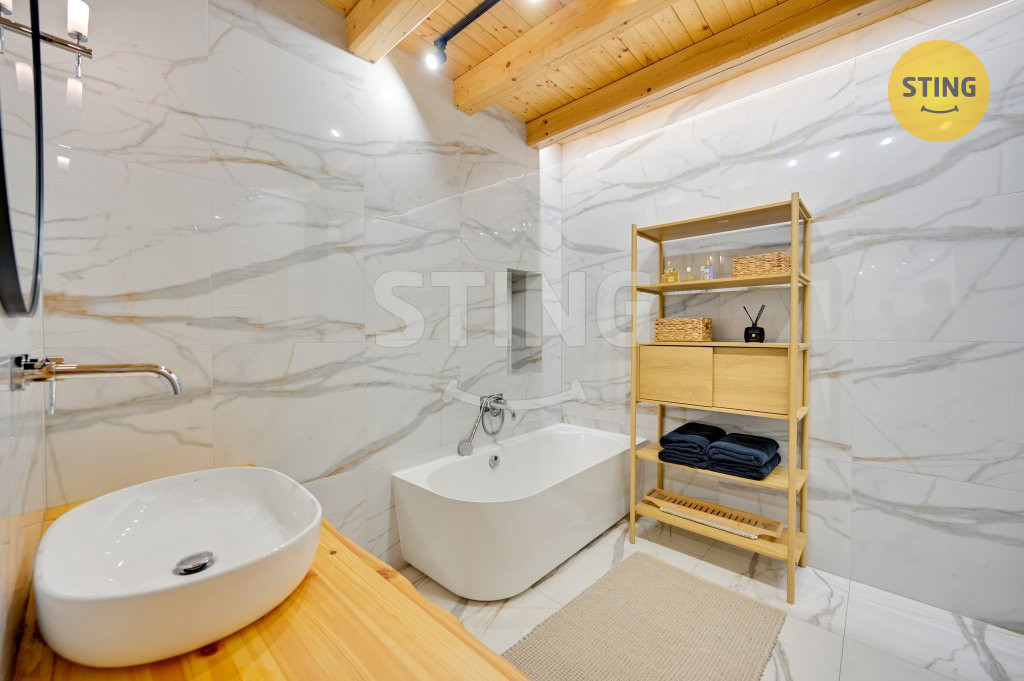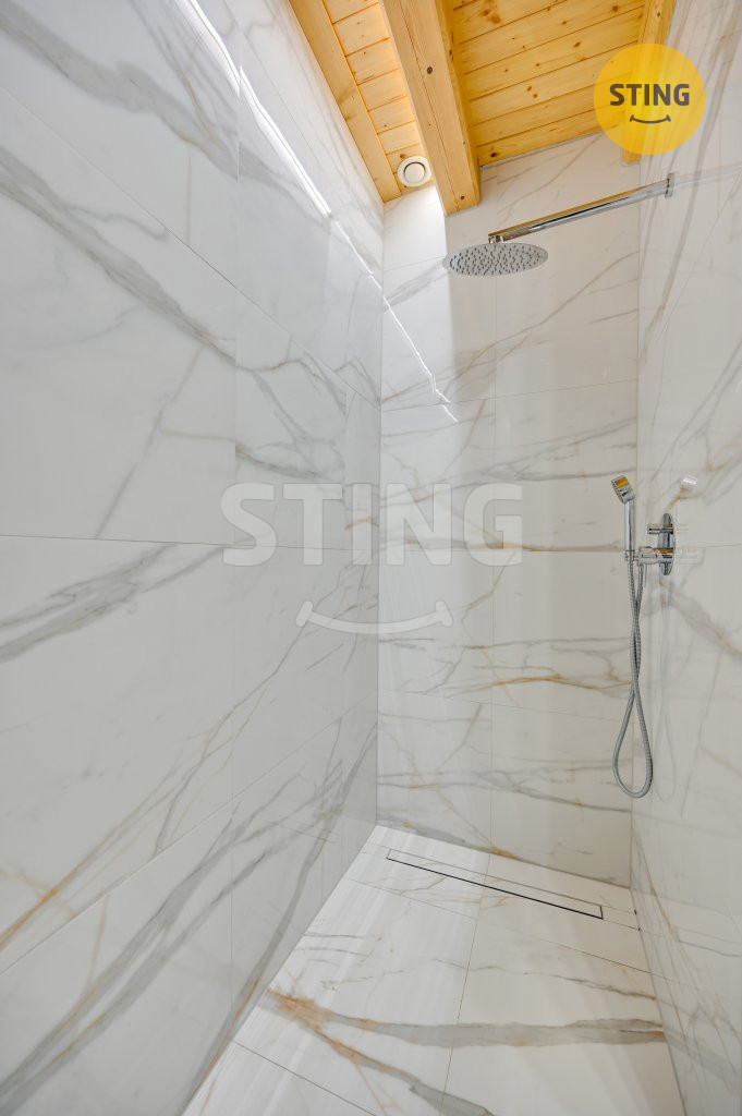 s filtrací a rovněž i posezení s krbem. Koupelna má vanu i sprchový