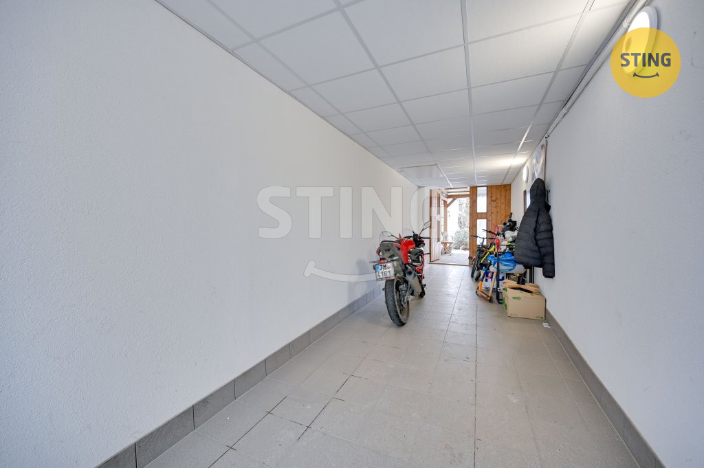 dlážděný dvůr s pergolou, technické místnosti (dílna, sklad, herna a