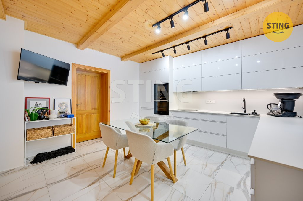 prošel rekonstrukcí interiéru v roce 2023. Dům má sedlovou střechu