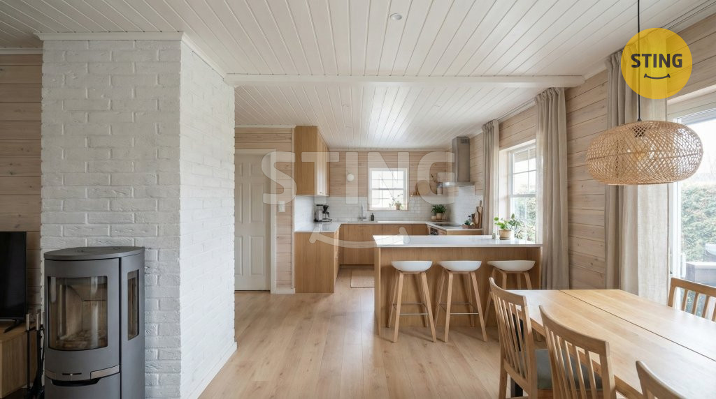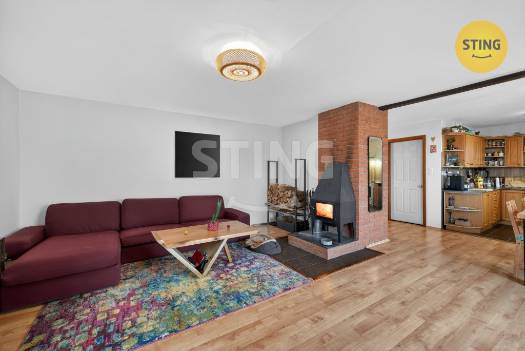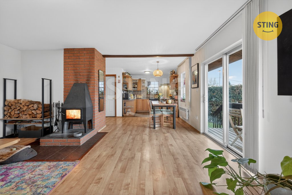 Kuchyně s jídelnou plynule navazuje na obývací pokoj s krbovými kamny a