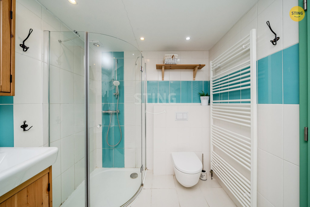 sprchovacím koutem + WC (6,04 m2). Napravo pak komora