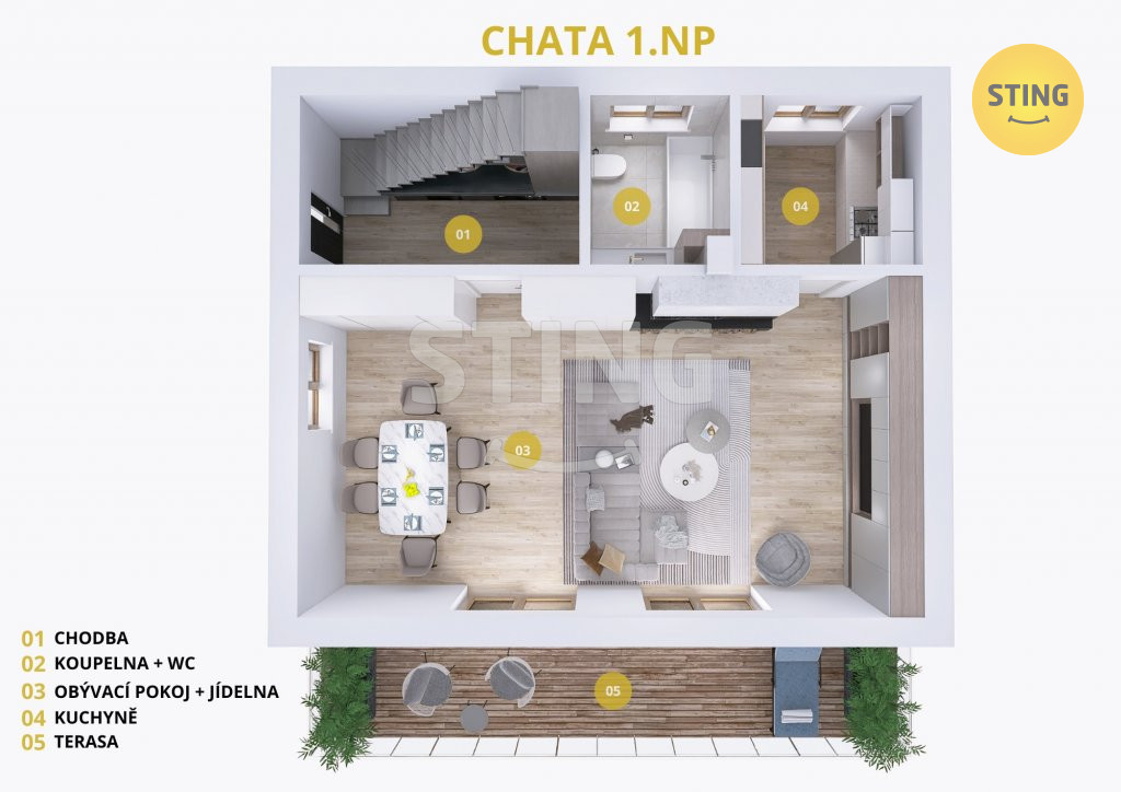 výhledem do údolí. Místnost pro kuchyňský kout, koupelna s toaletou