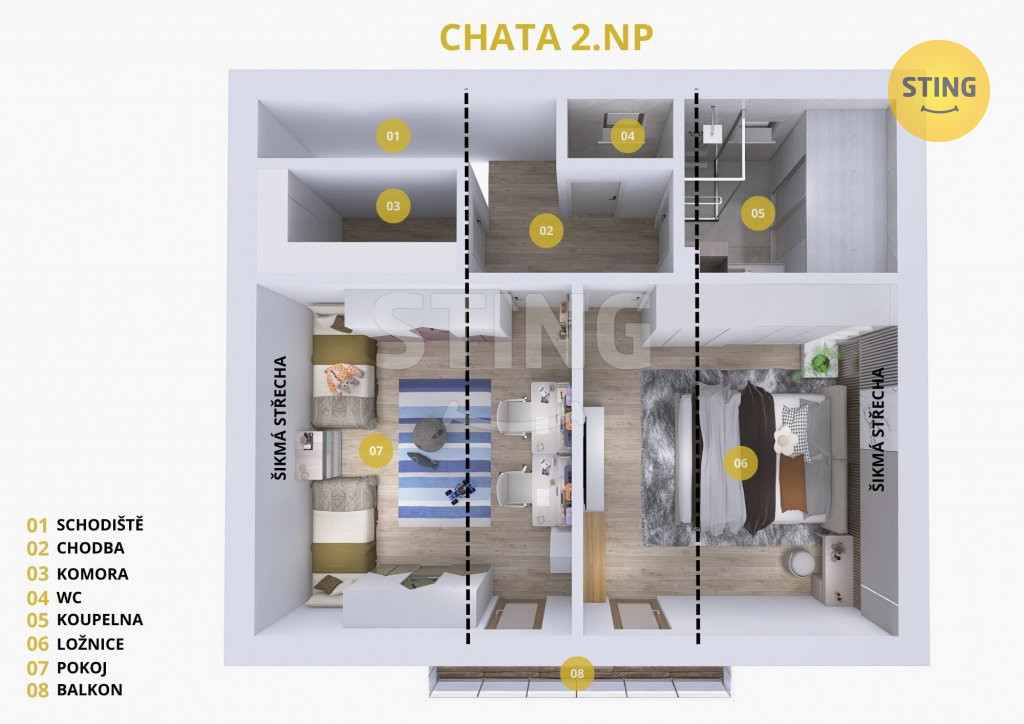 Patro: příprava pro 2 ložnice, šatnu, koupelnu