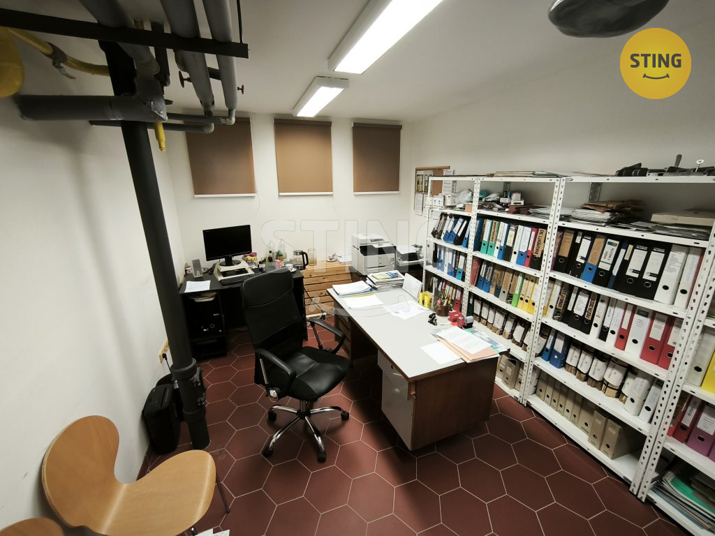 kancelář vybavená sprchovým koutem a toaletou. Celková užitná plocha