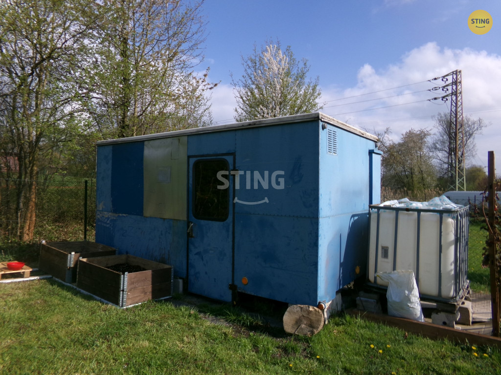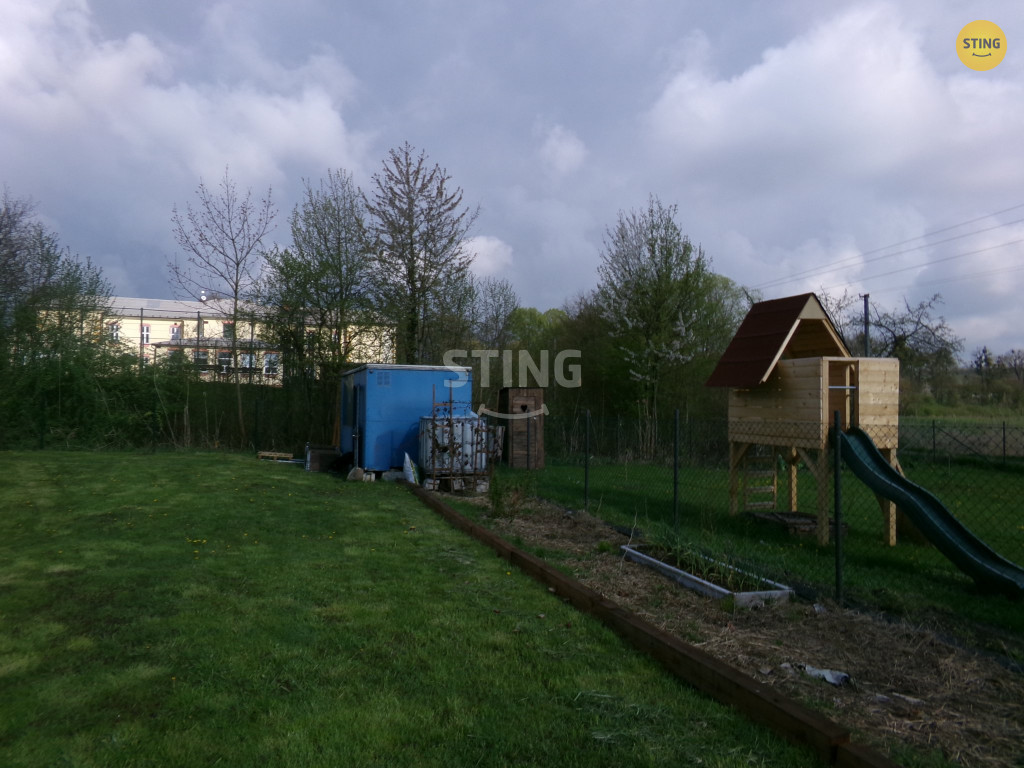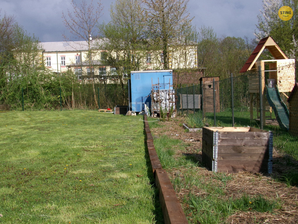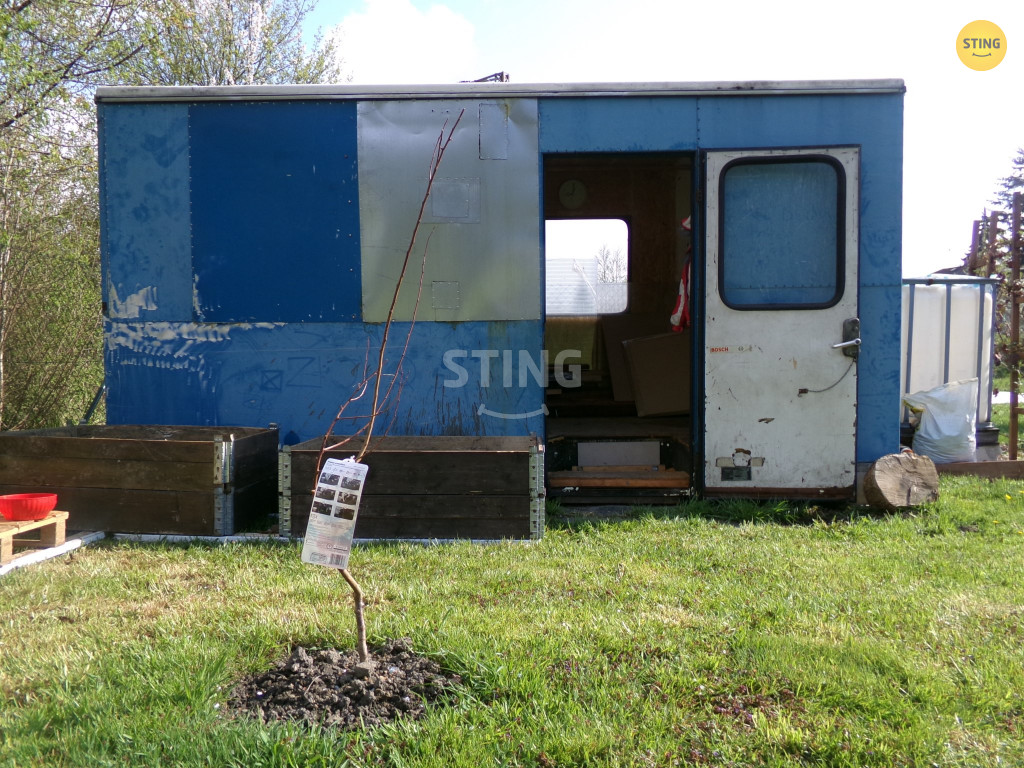 plechový domek, vyvýšené truhlíky a podél plotu jsou vysazeny okrasné