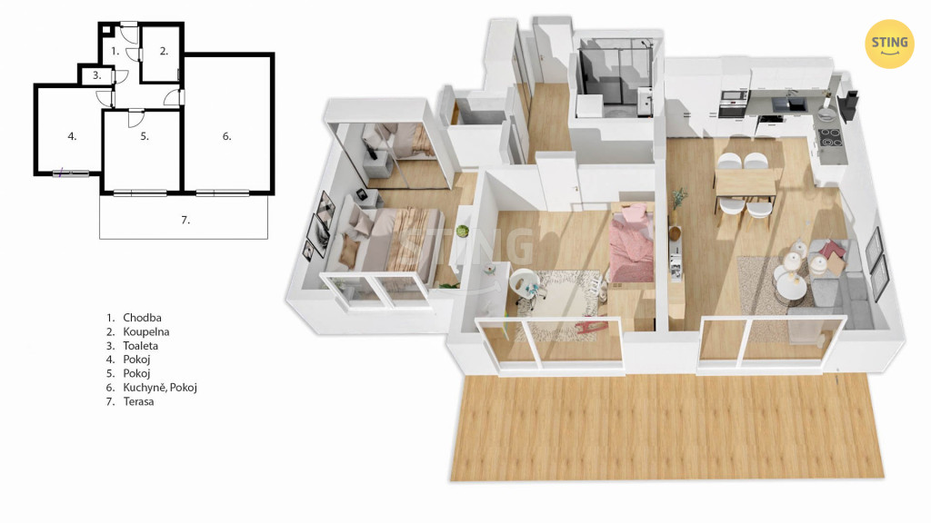 Nabízíme k pronájmu moderní byt o dispozici 3+kk, který se nachází