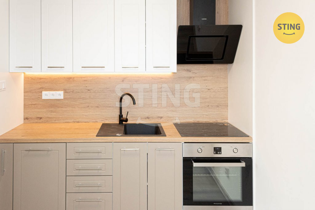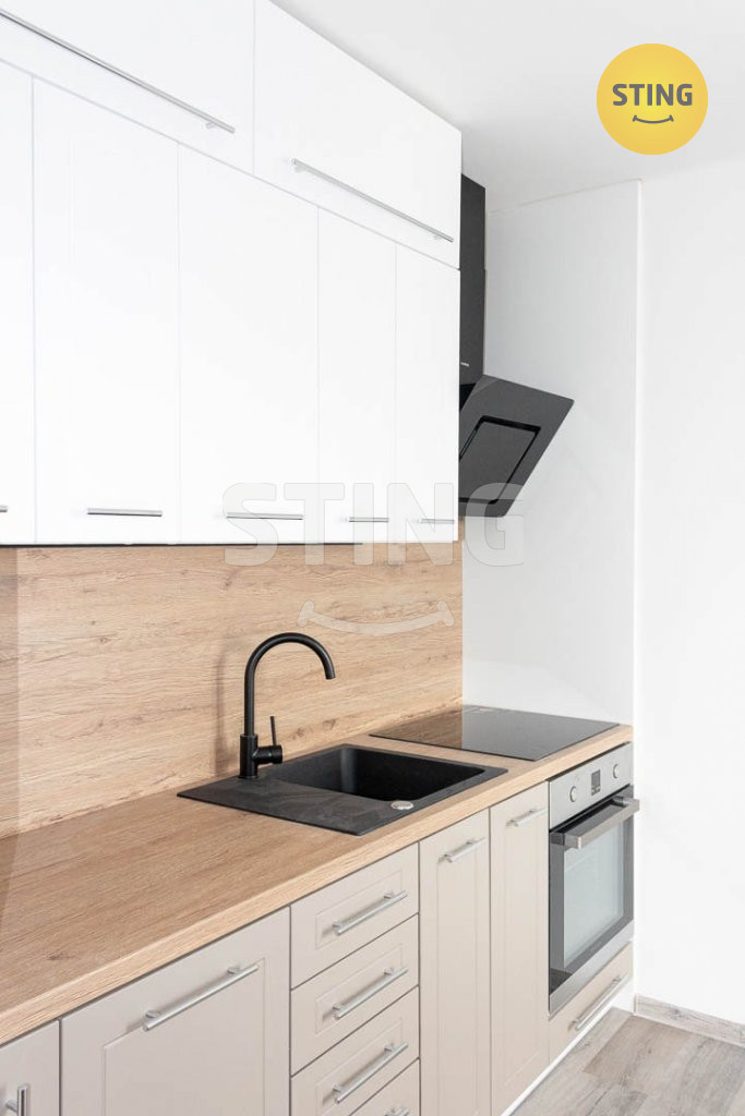 skříň. Kuchyň má novou kuchyňskou linku s vestavěnou myčkou nádobí,