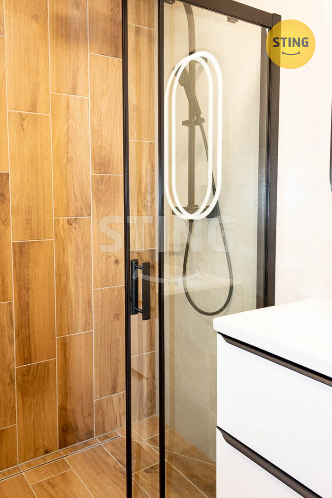 osvětlena LED páskem. Koupelna je zděná (v obkladech a s dlažbou) se
