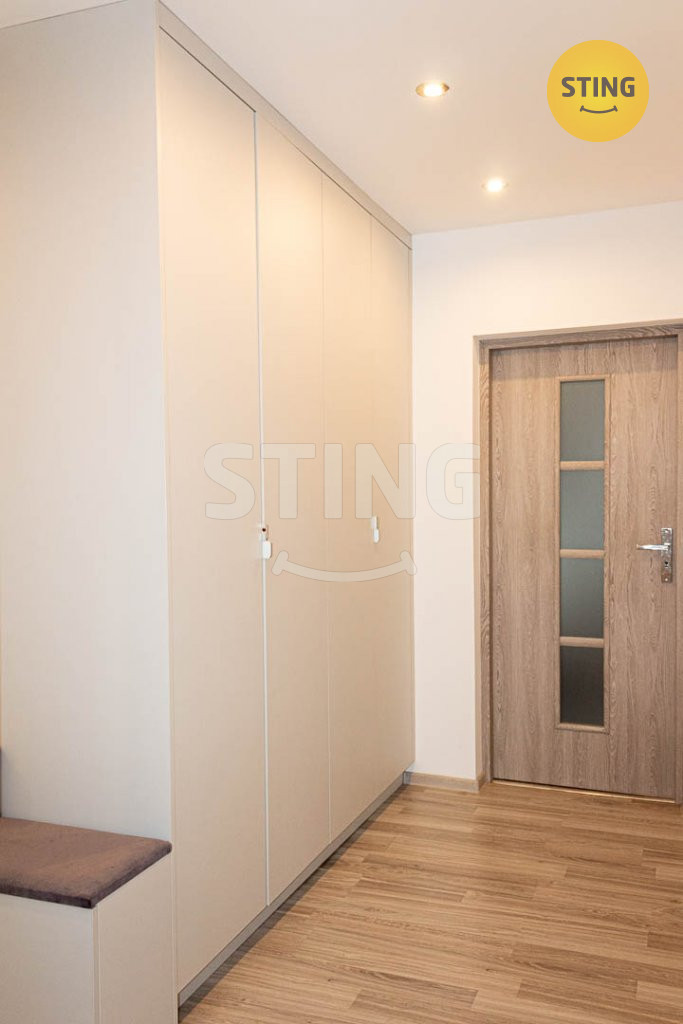 vestavěná skříň s dostatkem úložných prostorů. Koupelna je
