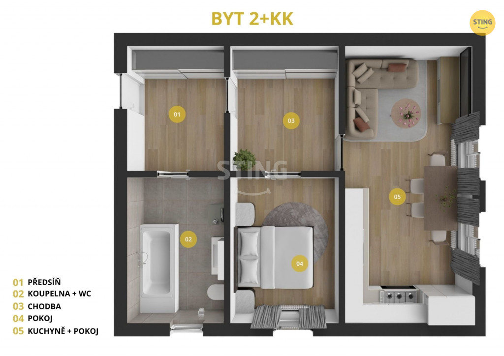 Byt má rozlohu 52 m2 a skládá se z obývacího pokoje