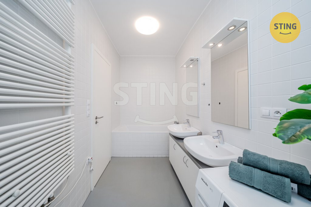 - Prostorná koupelna se dvěma umyvadly, vanou, WC, bidetem a pračkou Miele