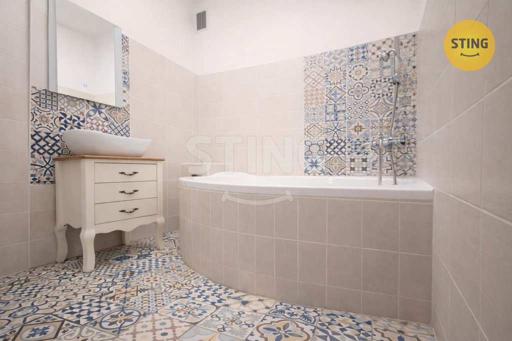 rohovou vanu, elegantní umyvadlovou skříňku a výraznou, moderní dlažbu.