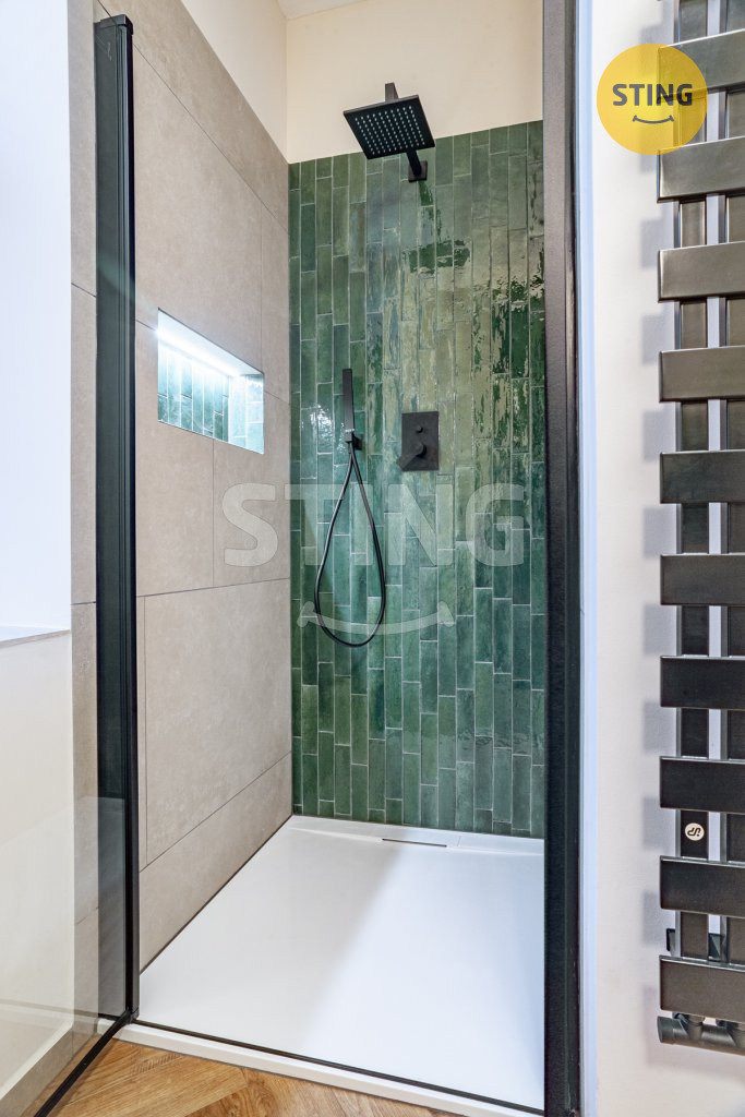Koupelna je vybavena kvalitními materiály a moderním sprchovým koutem,