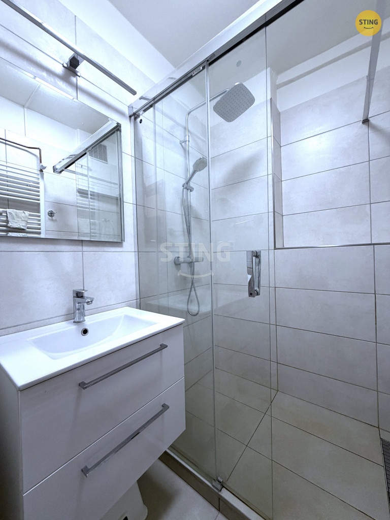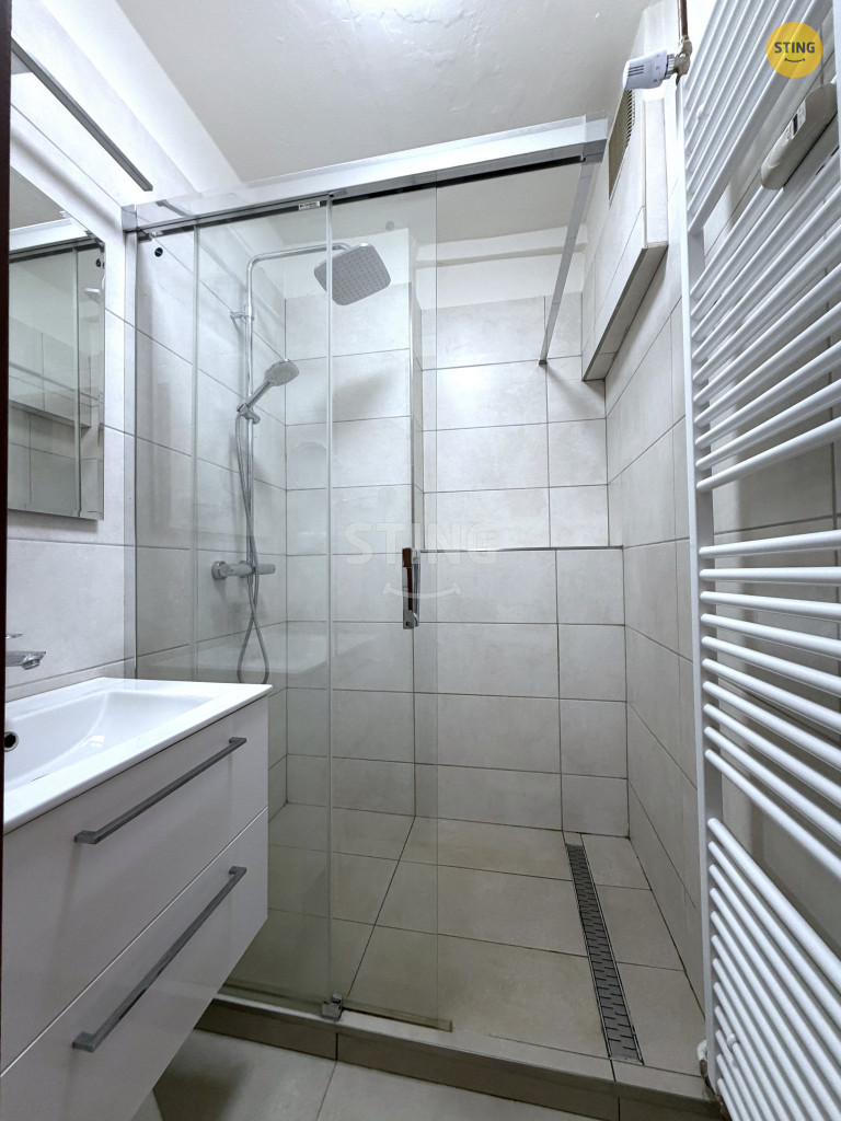 Koupelna disponuje sprchovým koutem, žebříkovým topením a umyvadlem se