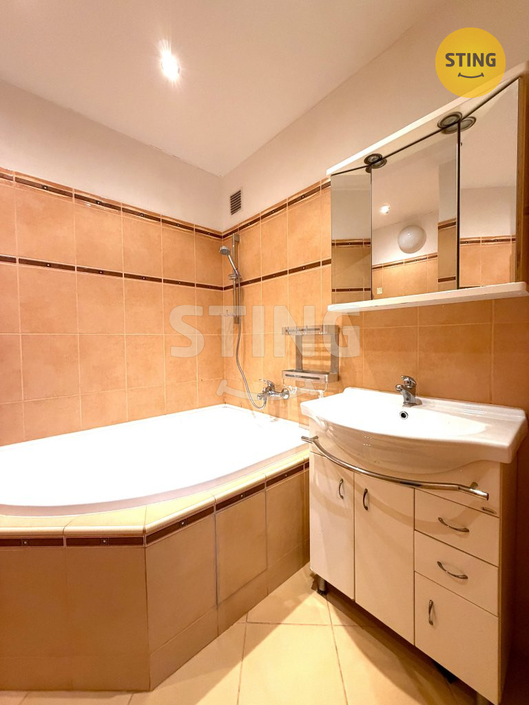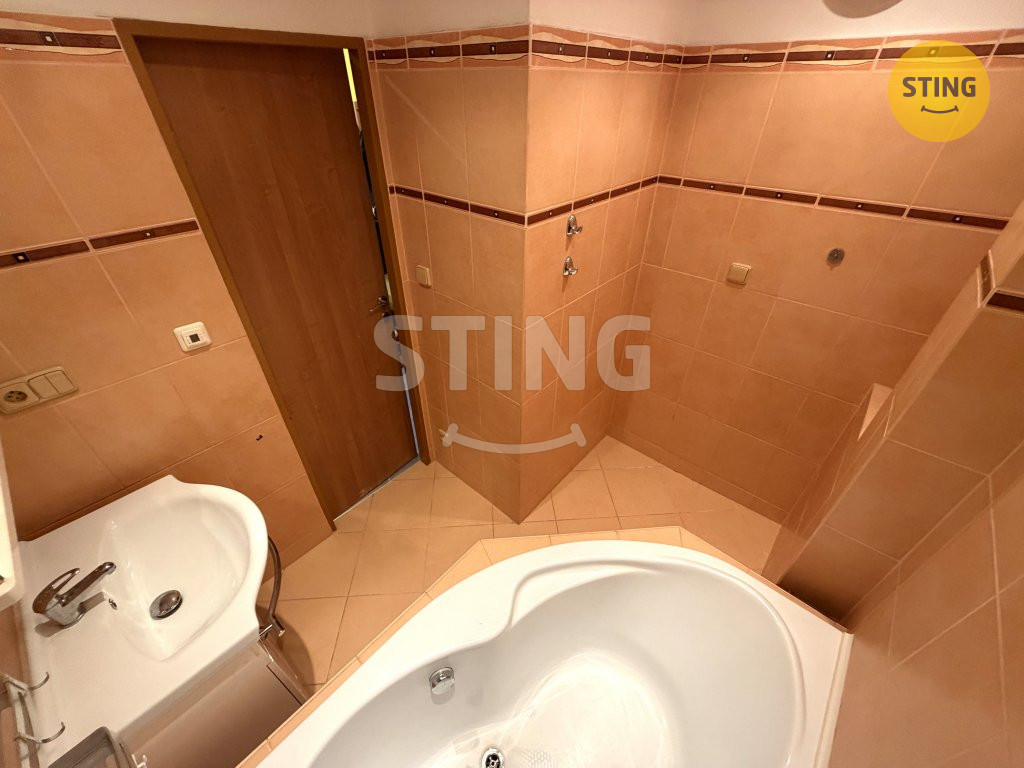 Koupelna je prostorná, vybavená rohovou vanou a místem pro pračku