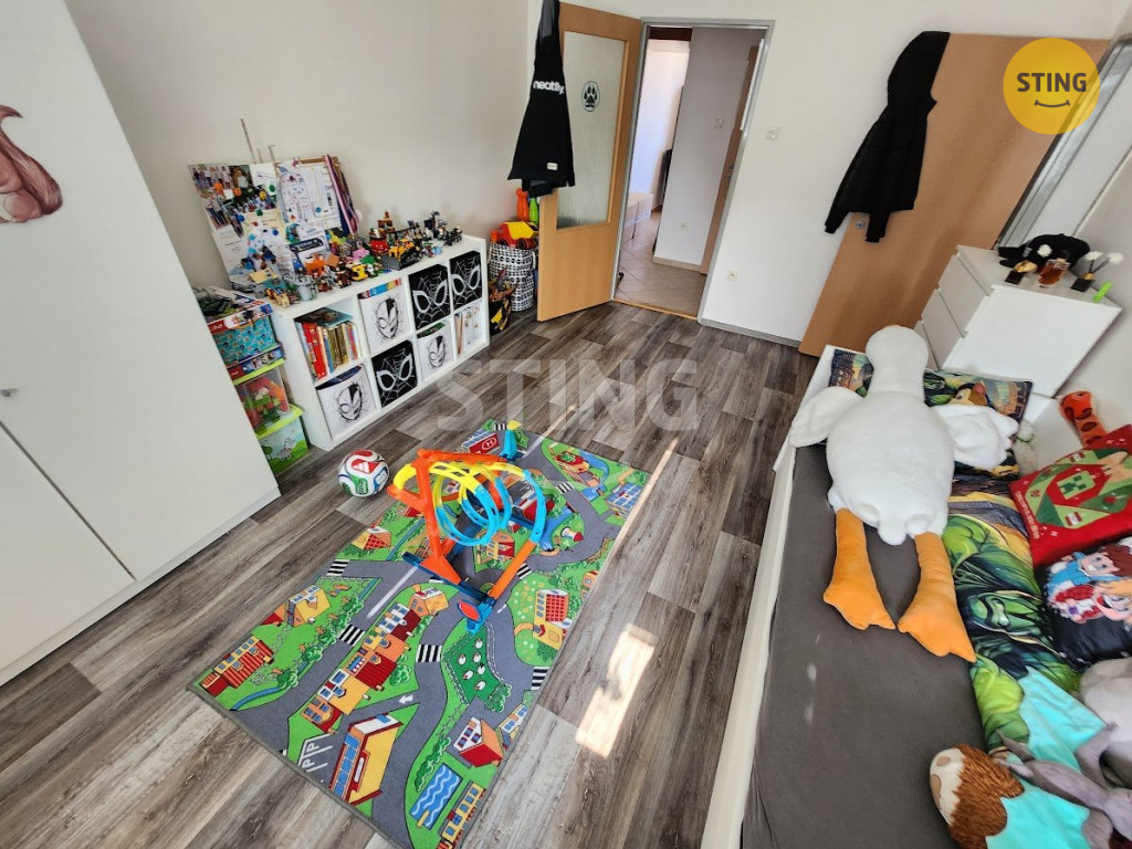 Byt se nachází v 5. patře cihlového domu s výtahem. Jeden z pokojů je