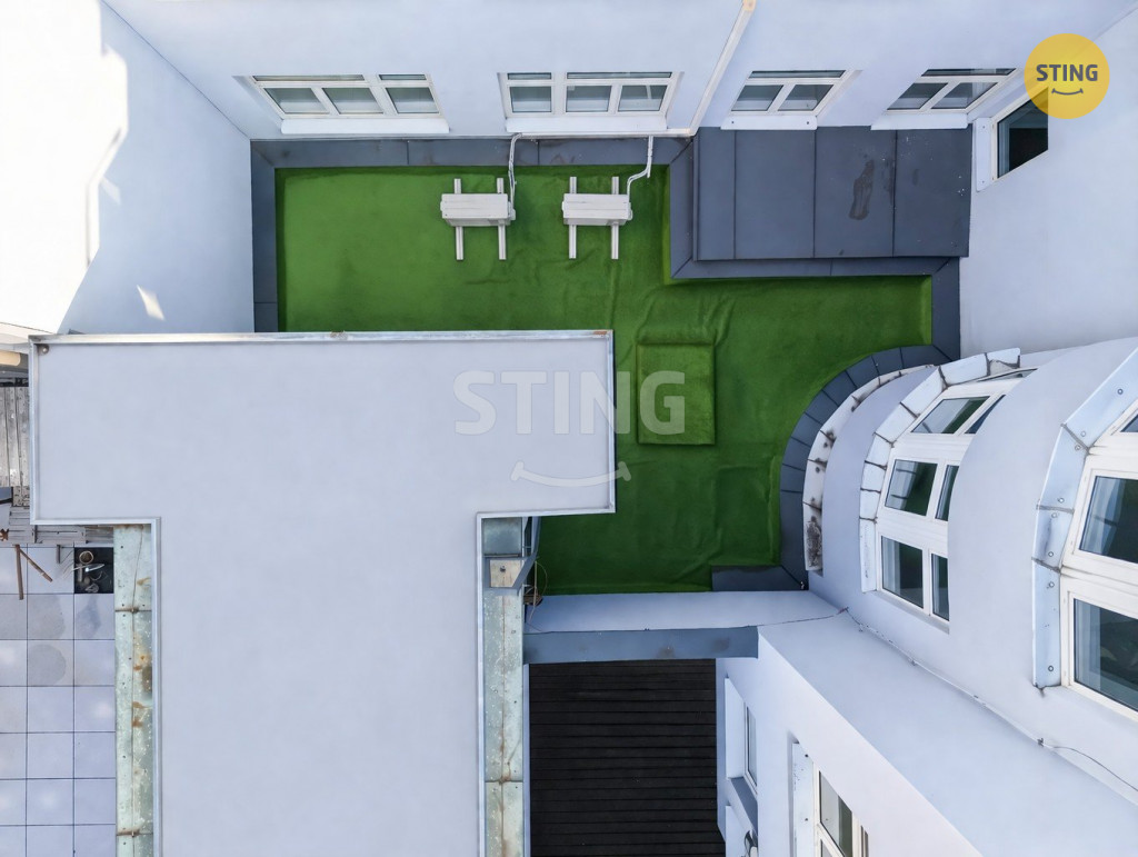 Střecha vnitrobloku je upravena pohledovým umělým trávníkem, který