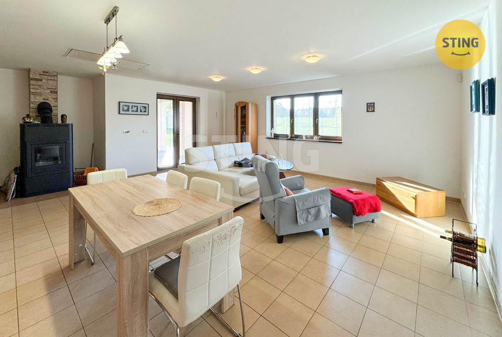 WC. Z obývacího pokoje je výstup na zastřešenou terasu a je zde umístěn